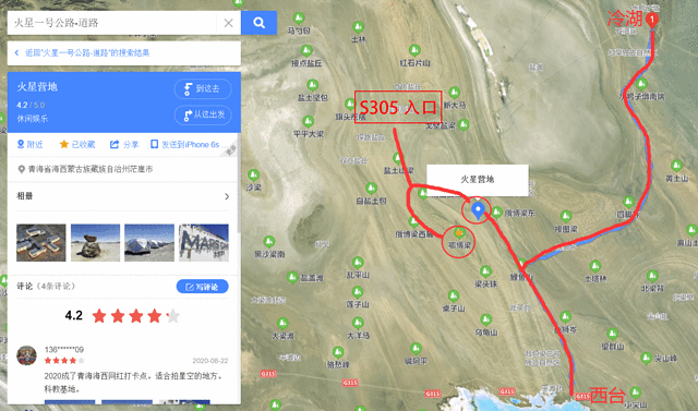 行车Tips:从花土沟镇-冷湖镇,约4小时,途中1-1.5小时左右路过黄瓜梁向S305拐弯,2小时以后就能路过俄博梁和火星营地的入口,过了这个口以后有区间测速限速80,导航软件可自动计算车速。