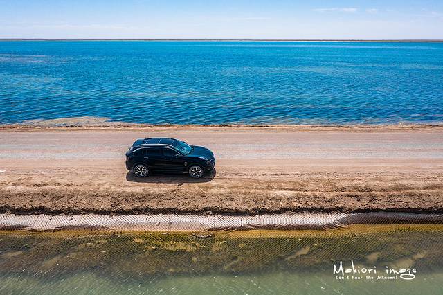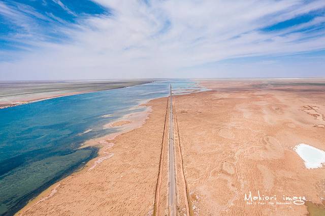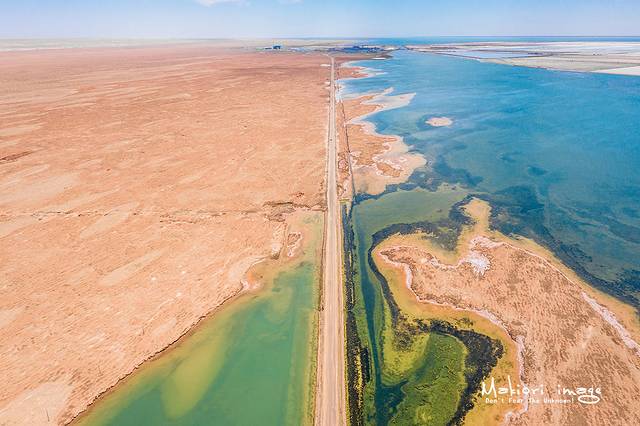 西台吉乃尔湖,就在水上雅丹继续向西不久的地方,也是G315唯一一段在湖上的景观公路,道路两旁分别是绿色和蓝色,很适合飞无人机跟车拍。