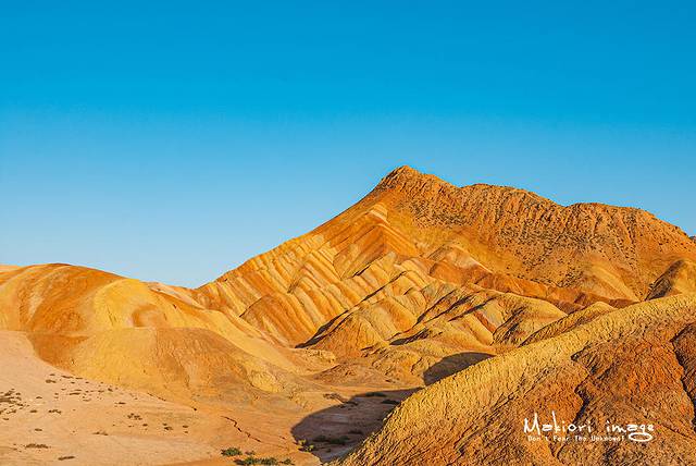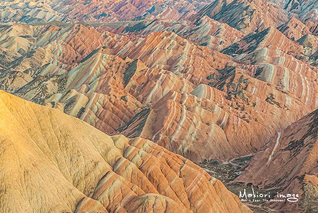 不过,我还是觉得日落余晖下的多彩丹霞更好看,特别像褶皱的五花肉、大扇贝。通透的黄昏阳光让丹霞反射出绚烂的色彩,足够让我拍案惊奇了,就像用彩笔在山头上作画一样,一道道的涂在山上,以橙红色为主,间隔着浅黄色、黄白色、甚至是青色,有些地方还反射出金色的光芒。