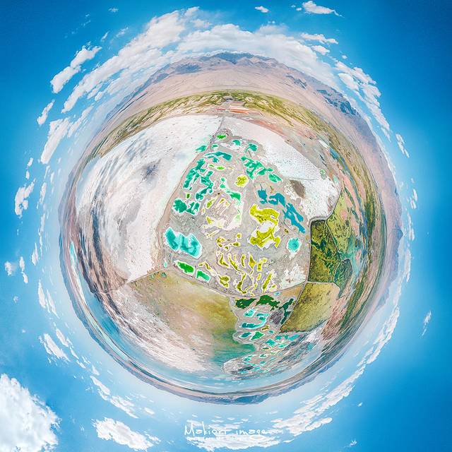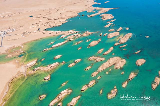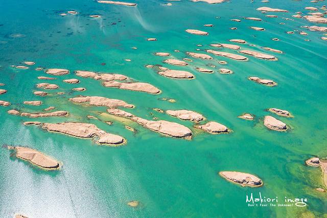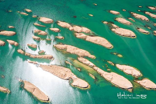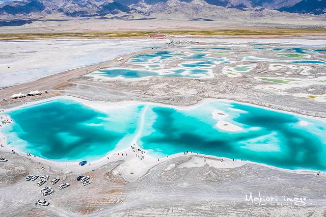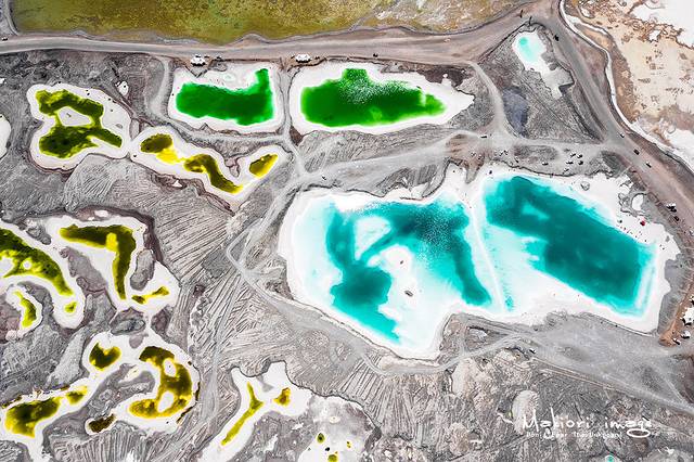 飞起无人机,只见形状各异,色彩丰富的盐池在柴旦湖中四处洒落开来,还真像大珠小珠落玉盘,这种翠绿让人觉得舒适宁静,带有些许遗世独立的感觉。水天一色,蓝绿相应,简直美的不可思议,无与伦比。