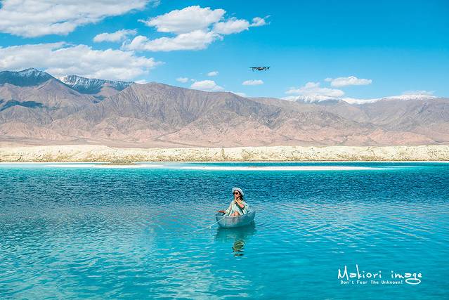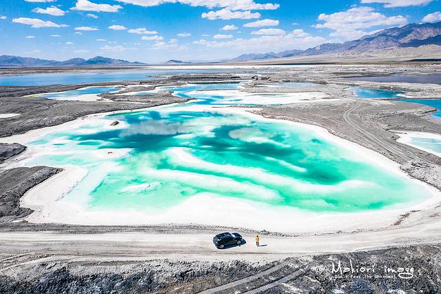 梦幻蓝色湖水的源头,是昆仑山鹤托坂日雪山和布喀达坂雪山。本就来自云端的雪水,纯洁无垢,而湖边凝固着的白色结晶,则是洪积、冲积、风积和湖相粘土等,交错综合的复杂沉积。