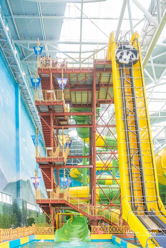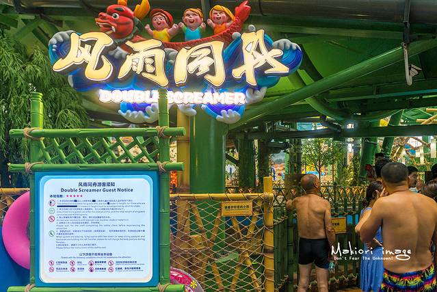 走进水世界,第一个要玩的就是右边区域的风雨同舟,据说它是全球首创第一个互动分轨水滑道,上方的出发平台高度达到20米,长达272米的滑梯总长度,短短的1分钟里,带你充分感受水中的速度与激情。