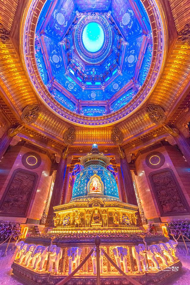 经过一场浩劫后,新修缮的灵山梵宫中,让人最惊喜惊叹惊奇的,就是在正中间仰望天穹星空的位置,多了一个全新的景点~地涌宝塔,这个新建的地涌宝塔具有升降功能,在进行表演时宝塔就会自动升起,游客可以情景式互动参与。