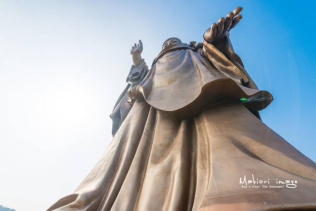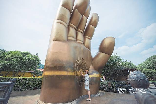 离开梵宫,就去大佛处还愿,一般会经历摸佛手,抱佛脚的环节。其中的佛手就是天下第一掌,每次来我们都要摸摸这个佛手,沾沾福气,万事不用愁。第一掌中间一圈被摸的锃亮锃亮的,可见是多受欢迎。天下第一掌与灵山大佛右手形状大小完全一样,高11.7米,宽5.5米,手指直径1米,总重量达13吨。佛掌的印相为“施无畏印”,寓意驱除众生痛苦,令众生无畏无惧。