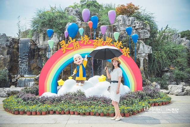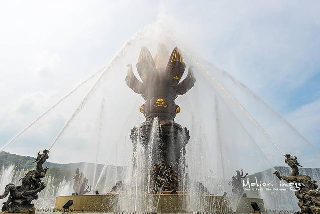 从大门进入的第一个景点就是九龙灌浴,这里是国内最大的音乐动态青铜雕塑群,讲述了释迦摩尼出生的故事。随着音乐的伴奏、莲花开合、太子佛从中徐徐升起,在九龙喷水形成的水幕中自转一圈。值得注意的是,每天有五次表演,表演过程中,广场周围的龙口会喷出功德水,游客可以拿瓶子接。