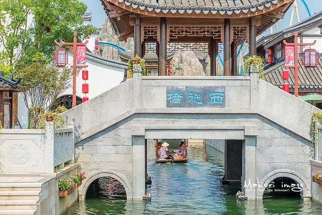 进入乐园第一个进入的区域就是运河人家,整个街区主打江南文化和城市乐园的完美融合。 古意乌篷船,泛舟江南烟波,品味吴越古风。 如果说“水”赋予了江南诗意和灵气,那么“桥”就是无锡漫长历史的载体。飞起无人机,可以清晰的看出运河人家区域的灵魂就是五座桥。