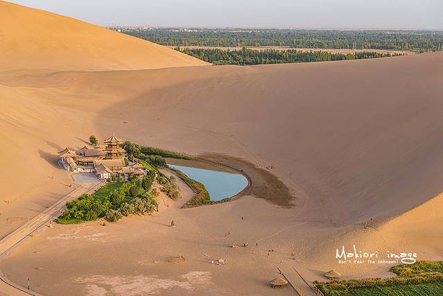 鸣沙山的另一边就是月牙泉了,迷你的月牙泉和旁边的木阁楼 ,周围被沙丘包绕,确实与想象中的不大一样。泉水在有阳光下呈现的是绿色渐变, 精致的月牙泉和小院落给粗犷的沙漠点上一点柔美,宛如一片沙漠绿洲。