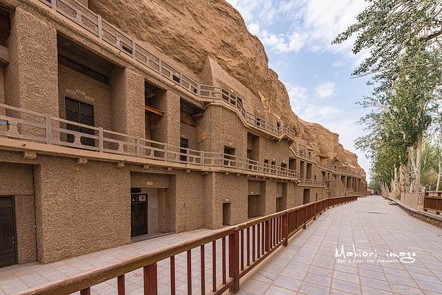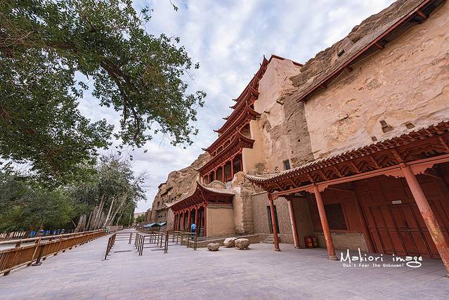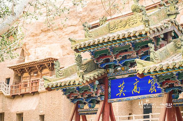 看完电影,就直奔莫高窟,一路上的苍茫让我禁不住内心的兴奋,即使河流已经干涸,也掩盖不住此处悠久文化宝藏散发的光芒。外部的莫高窟朴实无华,漫天黄沙,树影婆娑,伴随着微风轻抚树叶的窸窣声,一本历史文化百科全书迎面向我展开。