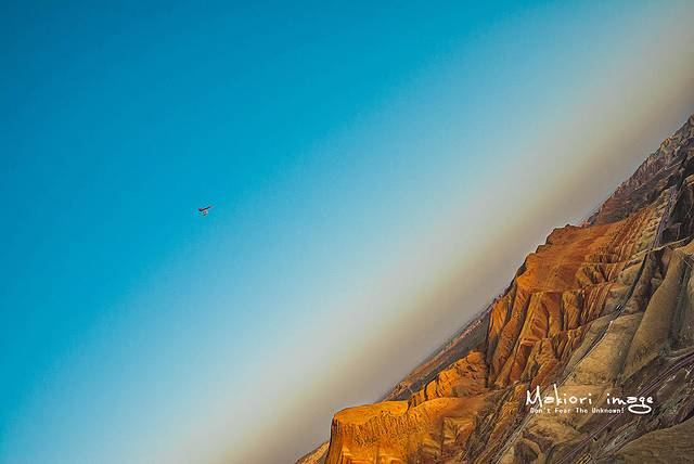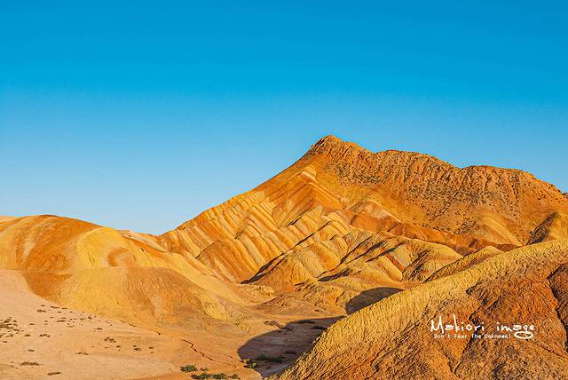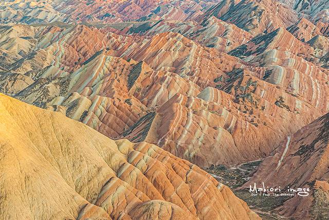 余晖下的多彩丹霞,特别像褶皱的五花肉、大扇贝。通透的黄昏阳光让丹霞反射出绚烂的色彩,足够让我拍案惊奇了,就像用彩笔在山头上作画一样,一道道的涂在山上,以橙红色为主,间隔着浅黄色、黄白色、甚至是青色,有些地方还反射出金色的光芒。