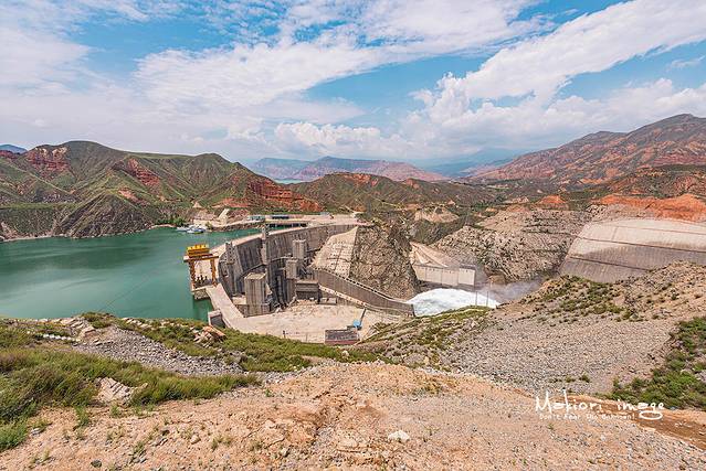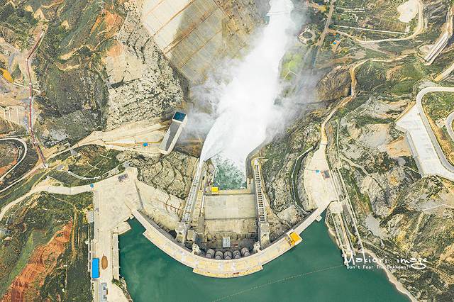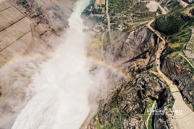 从高角度看去,更能仔细欣赏泄洪奇观,不同于传统瀑布的飞流直下三千尺,李家峡的泄洪用飚出去更为贴切,激荡的水花化作一把利箭,汹涌射向远处,澎湃的水气在阳光的照射下形成了一道迷人的彩虹。