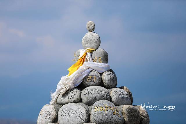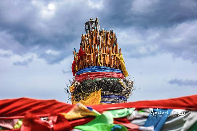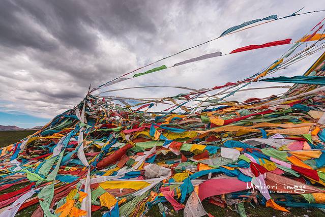 等待了许久,一束光突然照射在山顶上,阳光突破了黑云的重重封锁,预示着前方完美天气的到来。都说飞扬的经幡是飘动的魂,一簇簇、一条条、一片片……像是一朵朵绽放的五彩鲜花,点缀着万里高原的河流山川。在狂风中摇曳着彩色之身,在垭口上舞动着密密经文,每一次随风抖动都是心灵的祈祷,每一张斑斓经幡都是信仰的化身。