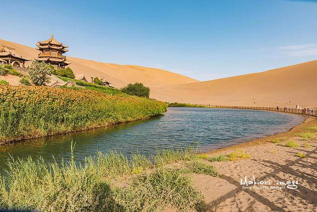 近处看月牙泉就是一汪水,神奇就在它身处沙漠,而不被沙子埋没,千百年来始终碧波荡漾,清澈见底,久雨不溢,久旱不涸。但是,随着气候的变化,为了保住月牙泉的面貌,敦煌还是花费了一番大力气。