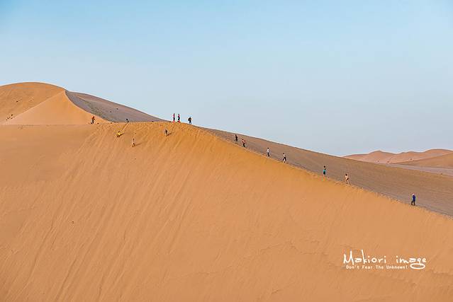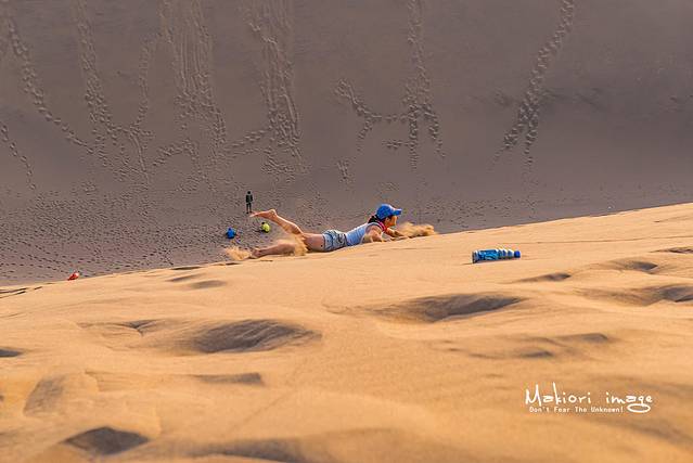 趁着太阳还未升高,沙子的温度还算适宜,一个人从顶上滚下来超级爽!一堆人在顶上喊“妹纸加油!”,然后就尽情地翻滚吧,虽然头晕目眩,天旋地转,嘴里进沙,但绝对是前所未有的体验。