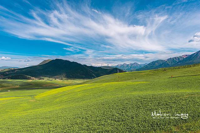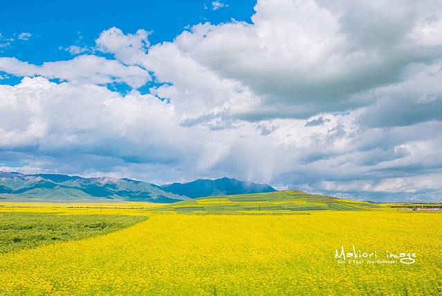 七月的青海,是色彩的天堂。纯净的蓝天,配合白云的舒卷,60万亩油菜花形成的黄绿花海成就了博大壮阔的奇特景观。