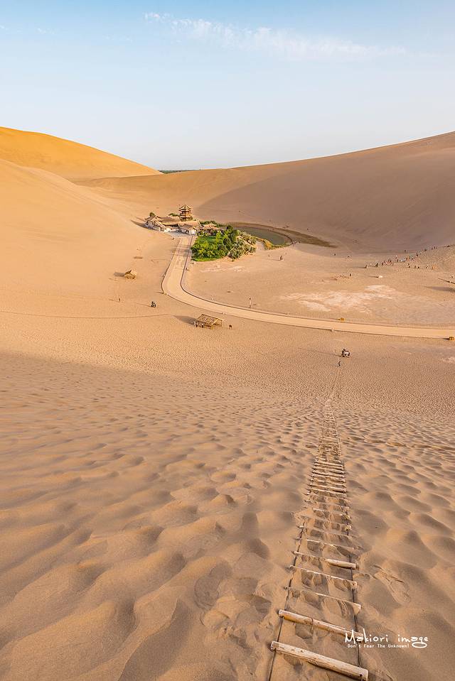 鸣沙山的沙子非常细腻,上山的时候如果不穿鞋套有点吃力,因为脚很容易陷进沙里去,建议直接穿凉鞋比较方便。坡度也算很陡了,如果直接走沙子上去,往上走两步就会往下滑回去一步,累的够呛也前进不了几米,但是这种自虐式的爬山方式,到了山坡顶端就有满满的成就感。