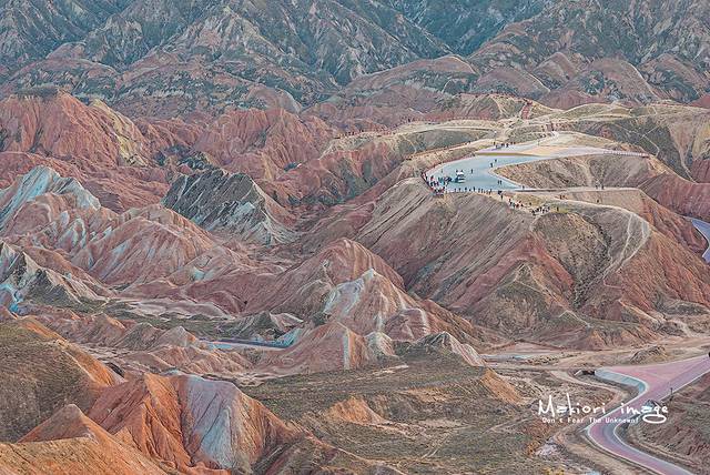 最经典的绝对是4号观景台,人气之旺使得这里早早被摄影爱好者占据,人山人海。随处可见的多种颜色把无数沟壑、山丘装点得绚丽多姿。红色砾石、砂岩和泥岩交错层理,远看红霞铺岩,近看色彩斑斓,层理交错的线条、色彩斑斓的色调、灿烂夺目的壮美画面,形成了一个彩色童话世界。