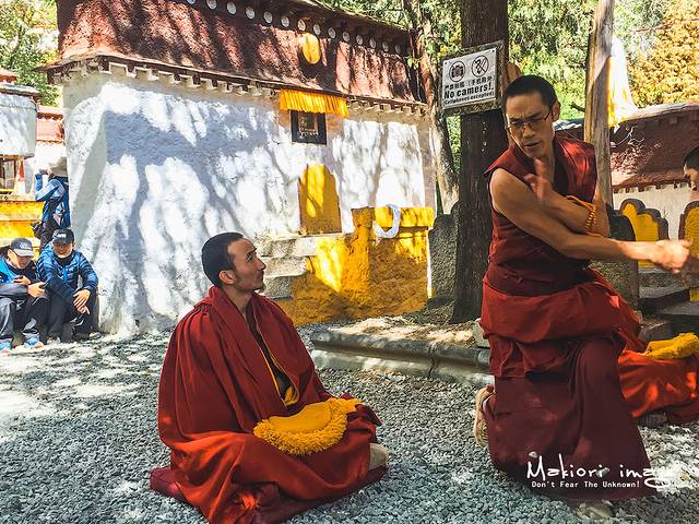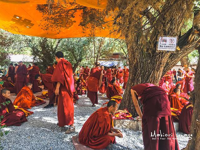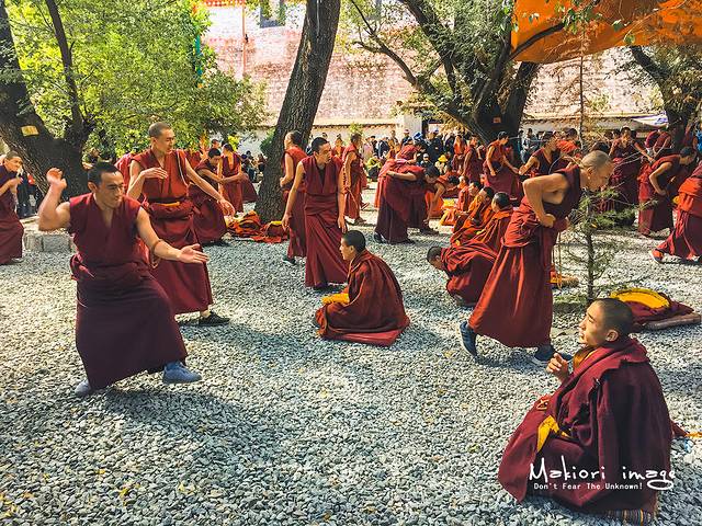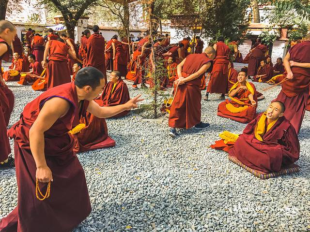 虽然听不懂藏语,但每个人生动的表情和夸张的肢体动作可以看出辩论的激烈程度,所有的游客都被眼前的这一幕给震撼了,津津有味聚精会神的看着好戏,尤其是很多外国游客,瞪大了双眼,不少人嘴里吐出了一个单词“amazing”