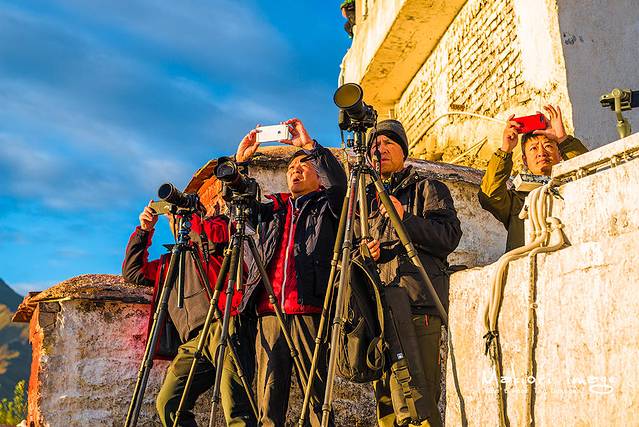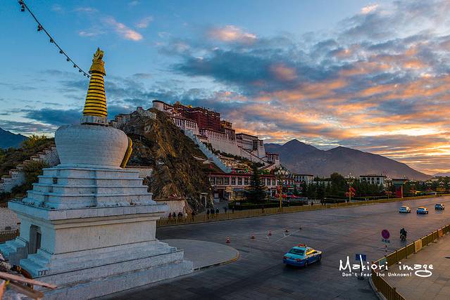 结果一下车,还时被眼前的阵仗给无语了。自己还是懒了点,上一层的观景台早就被密密麻麻的三脚架给占领了,留给我的只有下层平台的机位了,不过我后来还时比较了下,还是下层的角度和位置稍微要好些。看着远处的地平线开始变得金黄,在寒风中冻得瑟瑟发抖的我,仿佛看到了曙光一样,献上了虔诚的膝盖,随即按下了快门就得到了下图这张布达拉宫的标准定妆照。