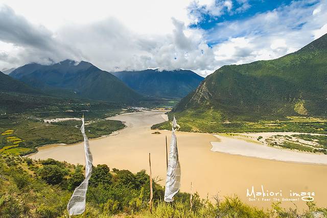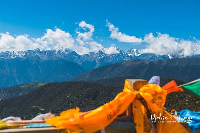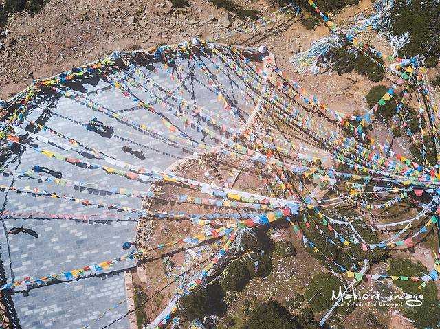 土墙周边装满了经幡,随风舞动,猎猎作响,藏民把它视为一处圣地。此处也是观赏南迦巴瓦峰的绝佳位置之一,只不过因为雨季刚结束不久,南峰始终隐藏在云雾之中,无缘相见。