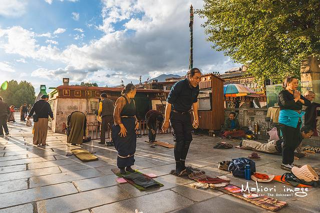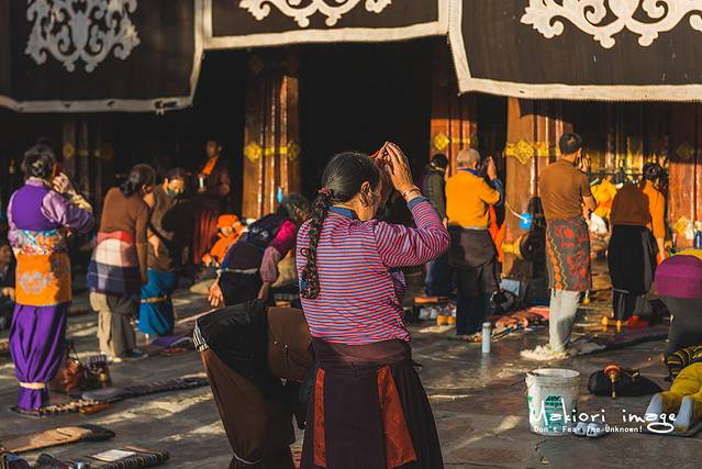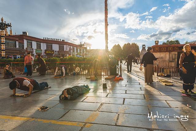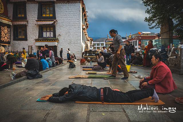在大昭寺门前,信徒们聚精会神的进行着大礼拜,从早到晚,日日夜夜,从不间断。这些信众们,大多经过艰苦的长途跋涉,从全藏各地的家乡来到这里,一路上磕上成千上万甚至几十万个长头,以实现自己内心长久以来的夙愿。信徒虔诚的敬拜,完全不顾周围游客异样的目光和相机的快门声,我站在旁边充满了敬畏之情,始终无法理解这些人到底为了啥,难道是生活太过贫苦给精神找点寄托?希望明天能过的更好?或者来世少遭受一点磨难?