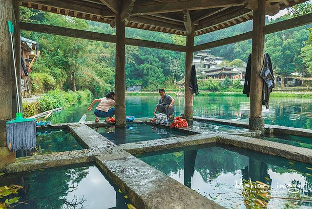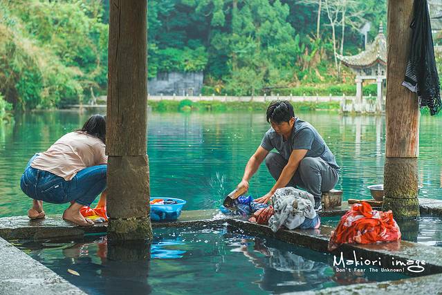 此时的和顺古镇刚从一片朦胧中苏醒,景区最深处的广场除了我之外,就只有洗衣亭下两个洗衣服的当地村民,据说这个洗衣亭是和顺先辈为了让妇女洗衣时有个遮风避雨的地方,从光绪年代开始,沿着河修建了多个形态各异的洗衣亭,因此洗衣亭也被认为是和顺古镇最独特和温柔的建筑。