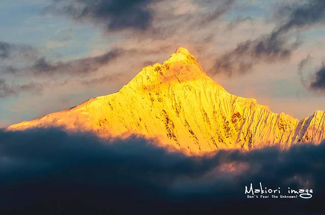 一团奇妙的云,包裹着梅里的顶峰,盘旋着迟迟不散开,绚丽的日落阳光把整片染成了金黄色,仿佛可口的芒果冰沙,就差这么一点点了。