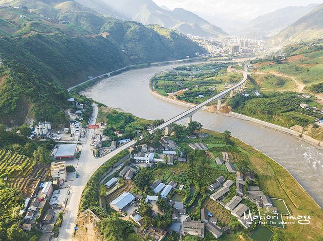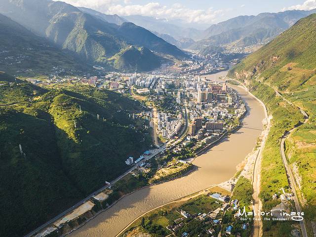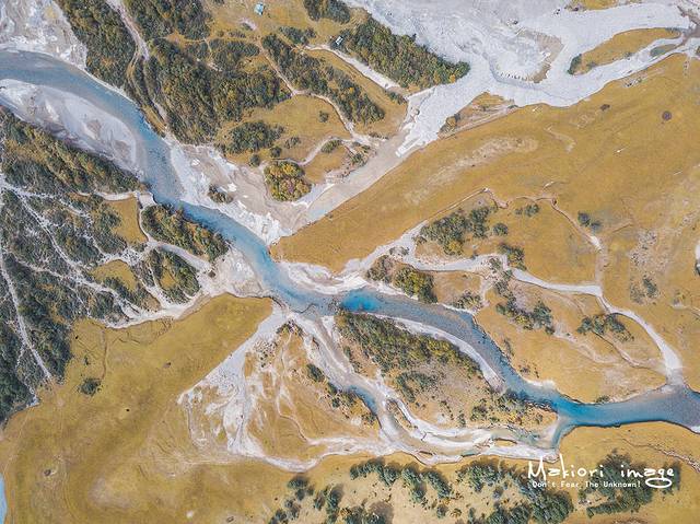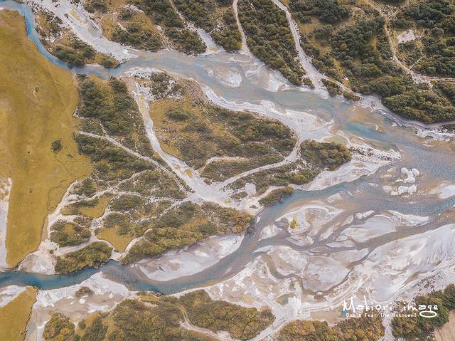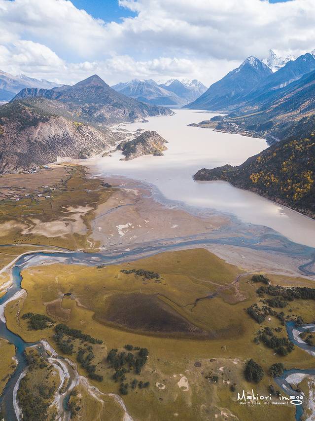 从地图上看然乌湖近似半月形,长度有20多公里,宽度却有几公里不等。整个湖泊分为上、中、下三段,每段之间有大片农田、村庄,由窄窄的小河相连,升起无人机从高空俯瞰,能够清晰的看到然乌湖的支流在大地上留下的脉动。