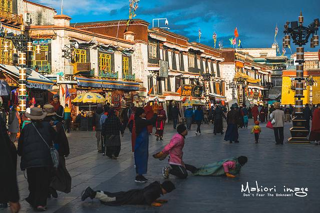 转经的信徒川流不息,凑热闹的游客也络绎不绝,置身其中,仿佛身后有股无形的力量推动着你快速向前,这是一种无法诉说的感觉。道路上,还有虔诚的信徒继续对着大昭寺磕长头。最小的信徒年仅6岁,而且身上套了一个麻袋在那反复磕长头,当我看见这种景象时,内心受到的冲击无与伦比。城市里的孩子6岁都在享受着童年的快乐,而这孩子却已经走在了信仰的道路上。