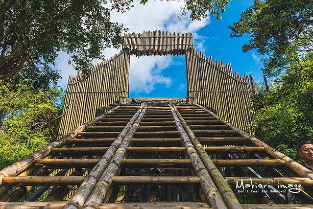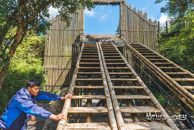 进入山寨的方式也极其特别,随着上面吊桥的缓慢降下,左右两边的工作人员把梯子一合并,瞬间就组成了一个可容三个人前进的天梯。