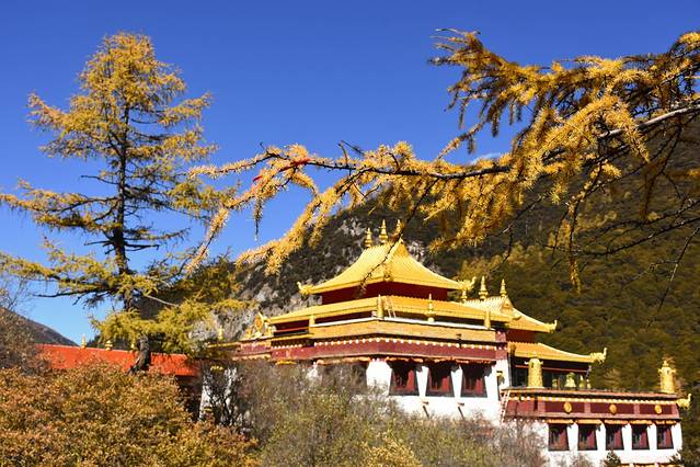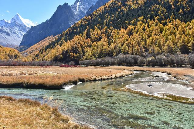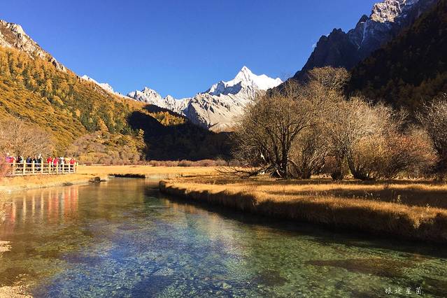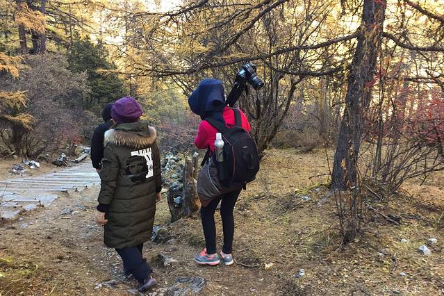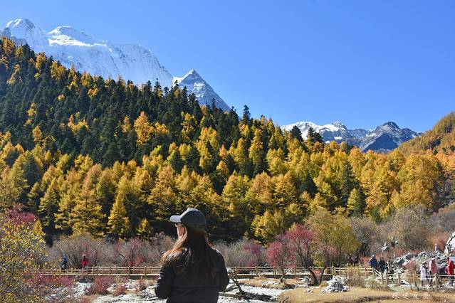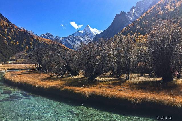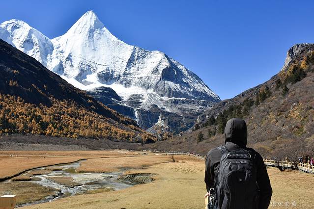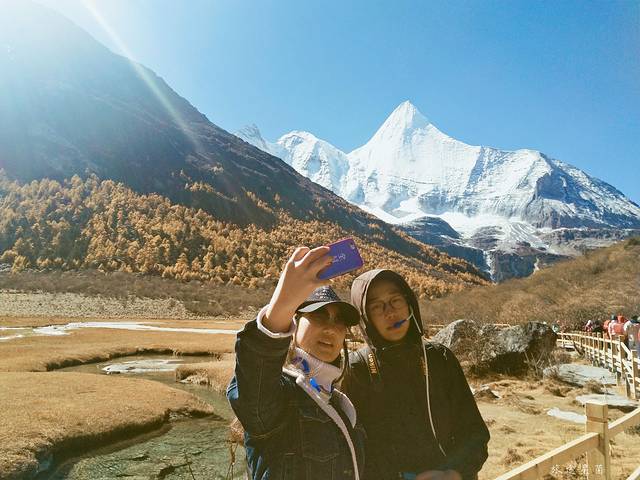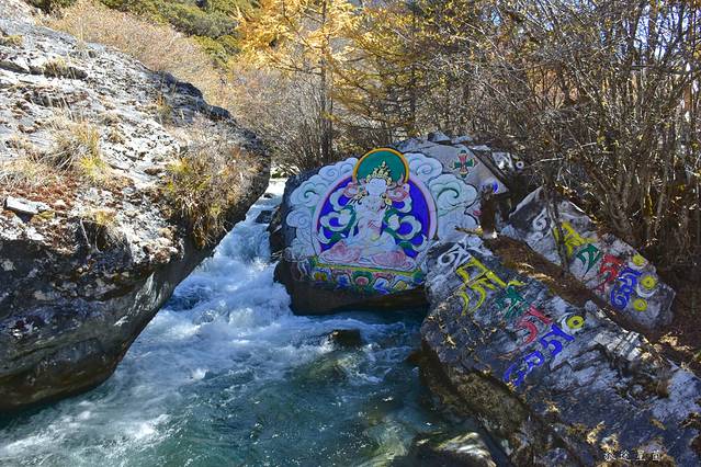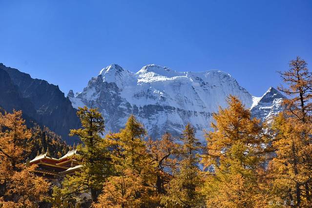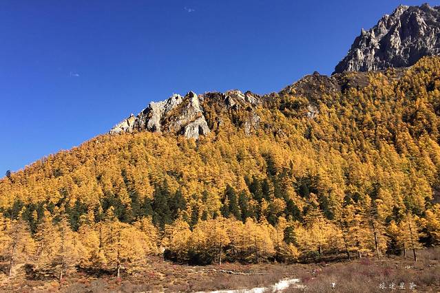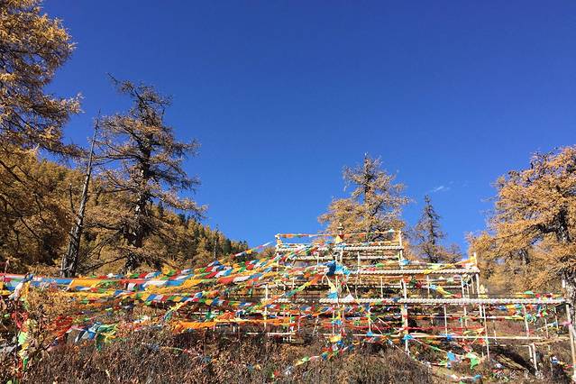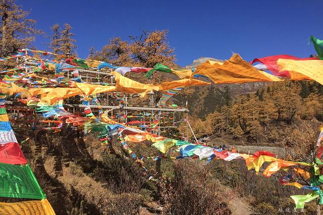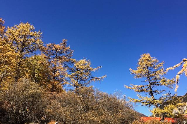 进入景区,你会发现这里有神圣的雪山,辽阔的草甸,斑斓的树林,五彩的经幡,碧蓝的海子,真的是五步一景,十步一花,我们来的时候正好是金秋季节,松树的叶子全都泛起了金黄,仿佛置身画中。