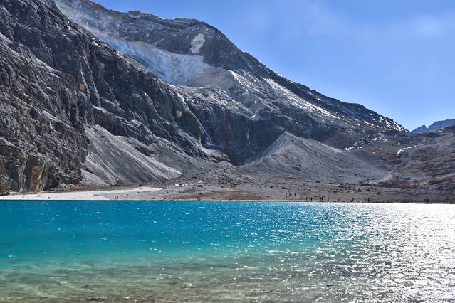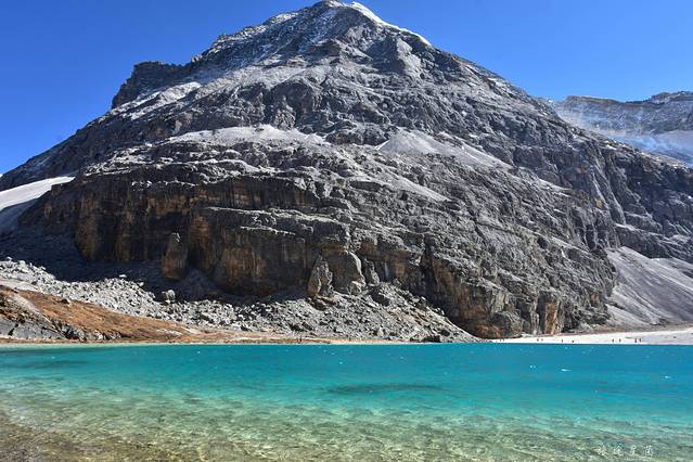 牛奶海是纯天然的古冰川湖,四周雪山环绕,和茫茫雪山相比,它的清莹碧蓝更让人眼前一亮,觉得爬这么久值了。海拔4500m,吹着7、8级的大风,望着眼前的美景,觉得活着真好。