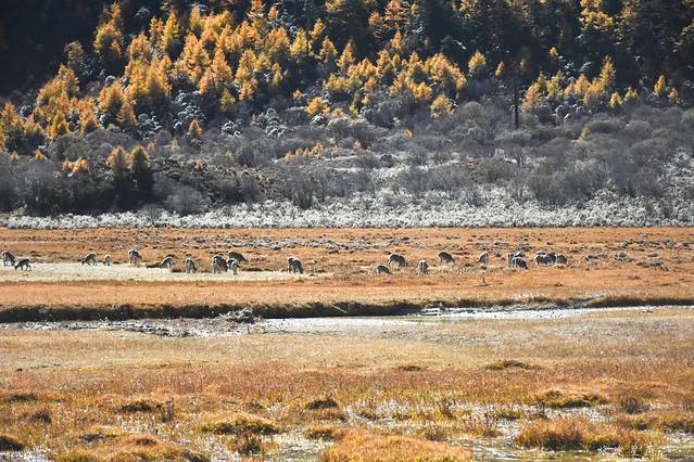全是草甸,有岩羊在远处吃草,下山回来的时候,景区内的马帮也都开饭了。看到马的屁股上都有一块块不长毛,我傻啦吧唧的问鹏哥“这马是有皮肤病吧,那一块怎么不长毛?”鹏哥一脸嫌弃的说“那是装马鞍磨的了。”心里忽然有些不舒服,心疼他们,所以景区规定200斤以内的游客可以骑马也算是爱护马了吧。