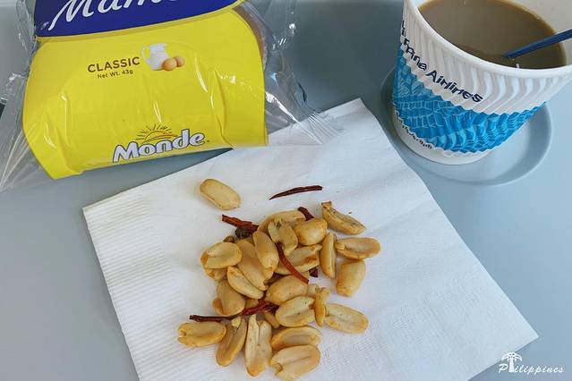 菲律宾航空的飞机上竟然还有吃的,要了杯咖啡来配我的酒鬼花生。