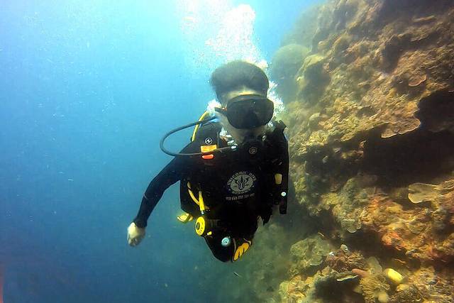 教练上来后问我还要潜吗,其实我是有点儿想拒绝,教练觉得我挺可惜的,前一天学习时候别人最困难的面镜排水在我这都是一遍过,其他什么技巧都没问题。那就一不做二不休,咬咬牙,克服一下心理障碍,继续下海。