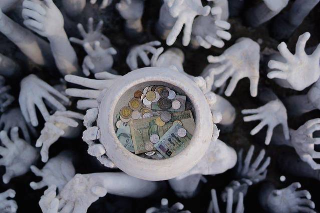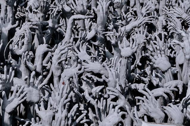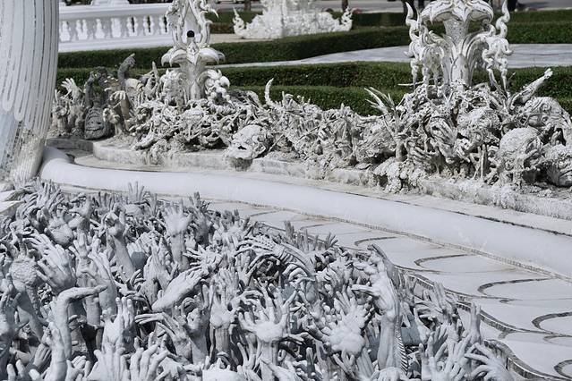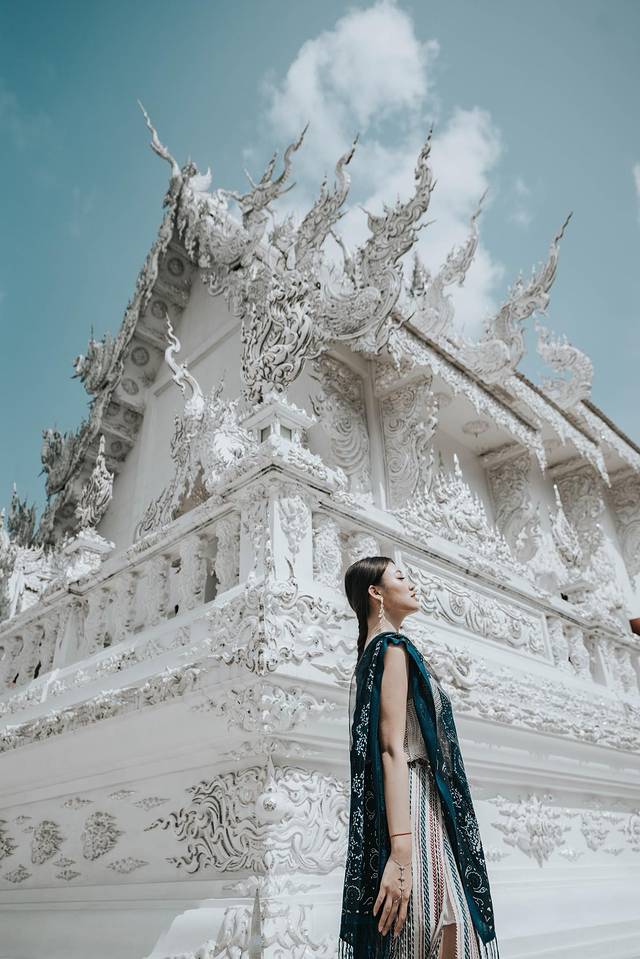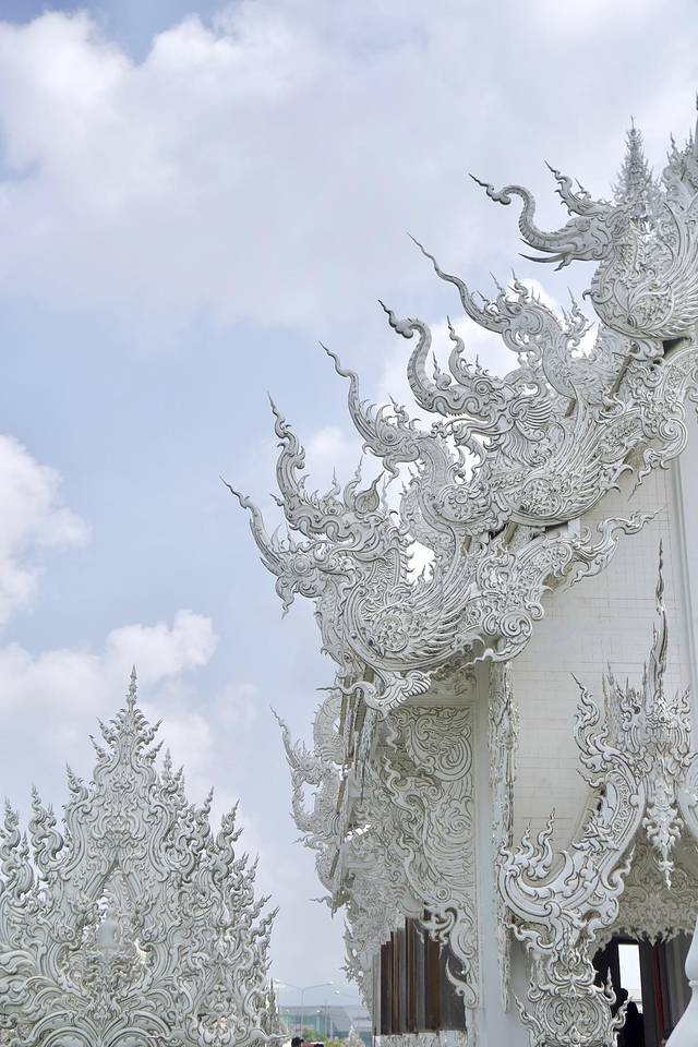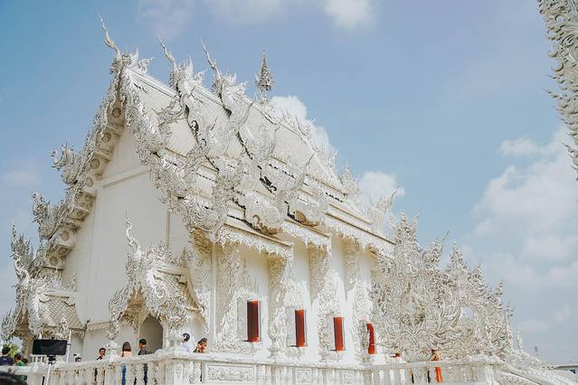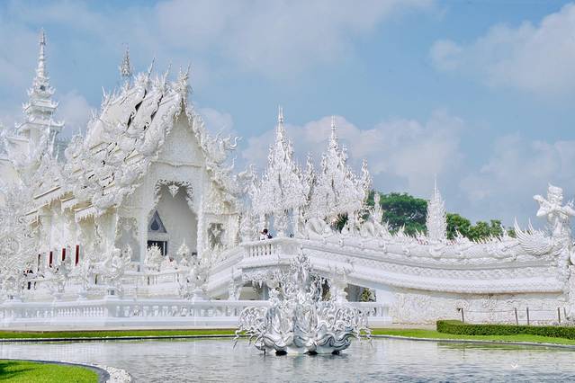泰国的寺庙大多是金碧辉煌、金光闪闪的,清莱的灵光寺 Wat RongKhun 却以它的纯白独树一帜, 别具特色。阳光下,这座白色的庙宇徜徉在蔚蓝的天空, 闪着炫目耀眼的光芒,就像一件美丽的艺术作品