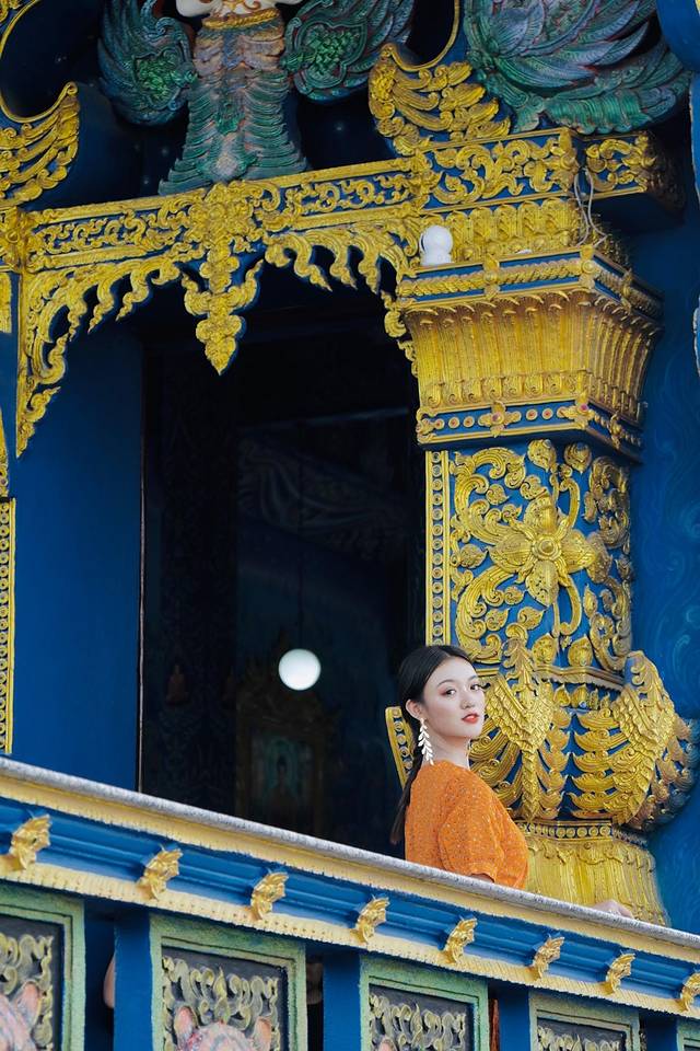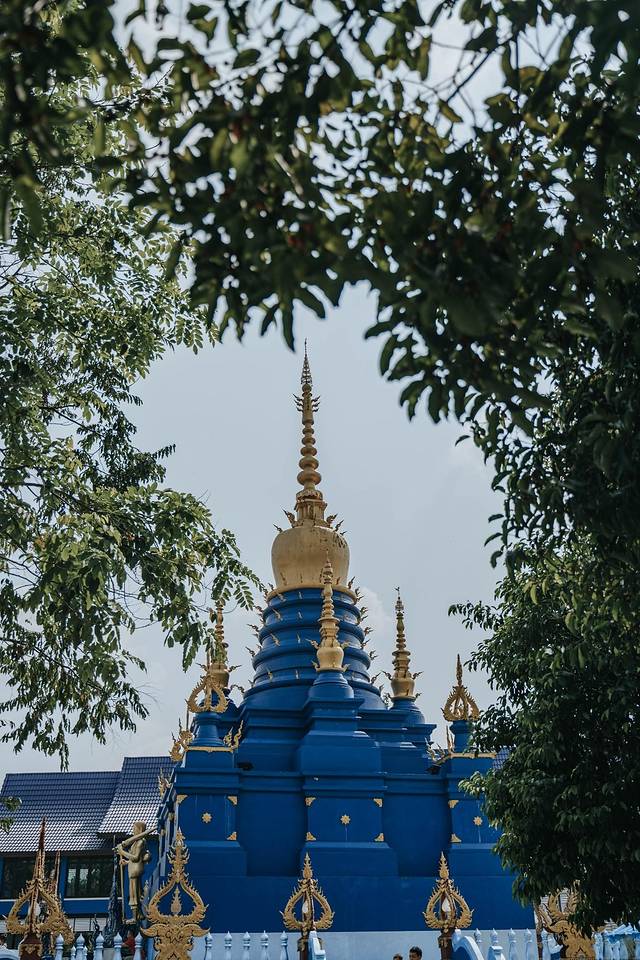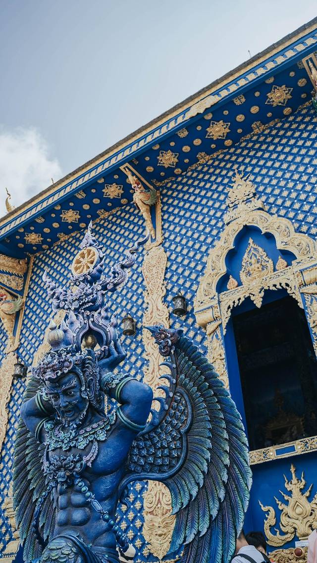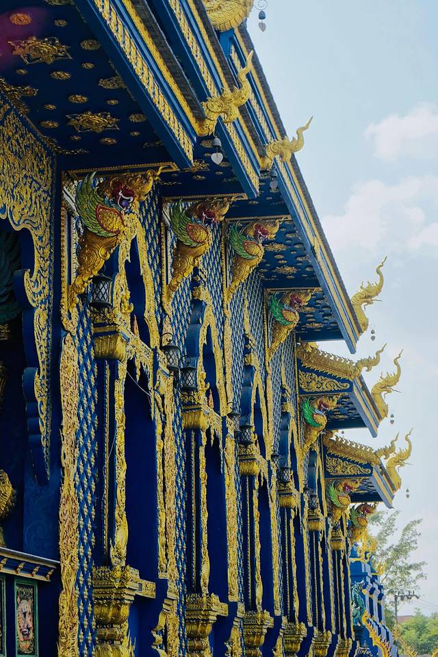 清莱蓝庙的蓝是深邃又凝重的,这是一种饱和度很高的蓝,有人说是湛蓝色,在淡蓝色天空的映衬下,蓝庙成为清莱最浓墨重彩的建筑,
