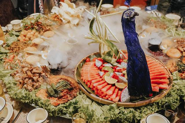 酒过三巡(其实并没有酒),这席傣族特色孔雀宴也算吃完了,剩下的食物感觉还能拼一桌中号的,也不知道大家在含蓄什么......