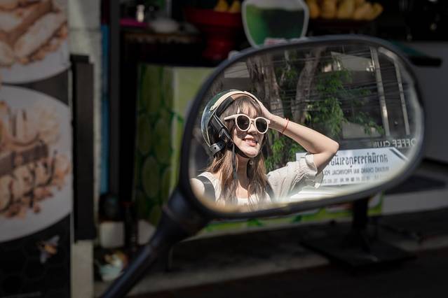 骑摩托:必须戴头盔,停车时可挂在车镜上,不会丢。