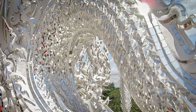 有人曾问他,这座庙为什么是白色的,他说白色代表纯洁,而玻璃片代表智慧,闪闪发光