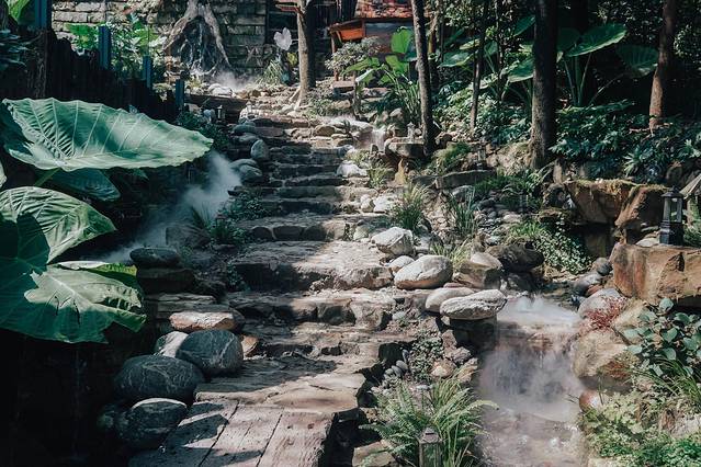 沿着花园里布满绿植的石阶下去,就像走进一个森林里,从石阶两旁的溪流升腾起缭绕的烟雾,每走一步都烟雾跟着晃动仙气满满。