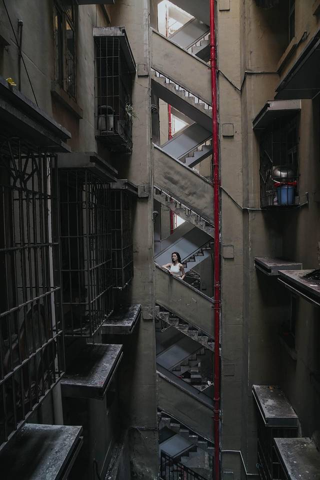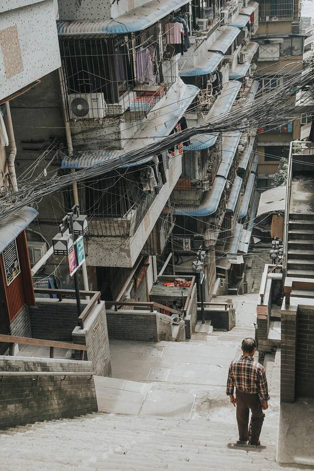 重庆的小巷、高楼,一节节不知将通向哪里的台阶都令我着迷,这里的楼房很密集,一幢幢或高或矮的老房屋交织在一起,甚至好多树都嵌在了房子里
