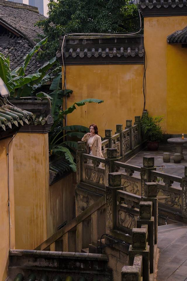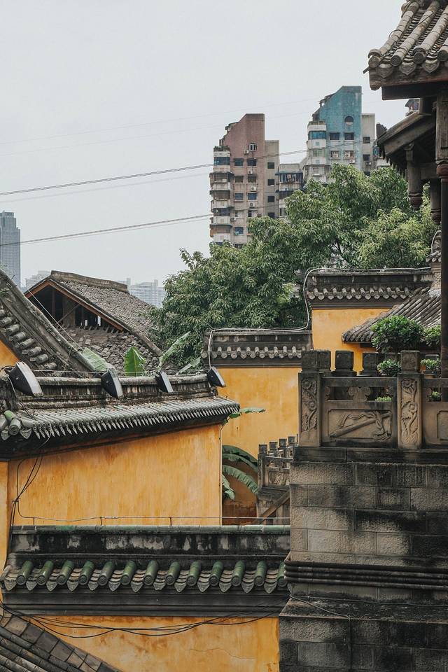 清一色的明黄墙壁格外醒目,灰瓦如鳞,在黄色的底子上温柔地点缀,共同谱写出古老的曲子;不远处滚滚长江以充满力量的低音很有节制地把它唱出来。