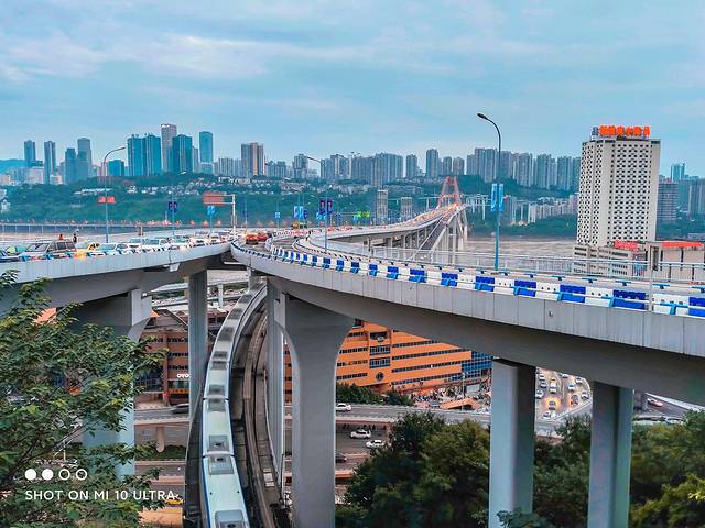 轻轨2号线、3号线的换乘站,作为高峰期的魔鬼换乘站,人流量非常大,在玻璃长廊漫步或驻足,壮阔的嘉陵江景和繁华的山城街景都能尽收眼底。
