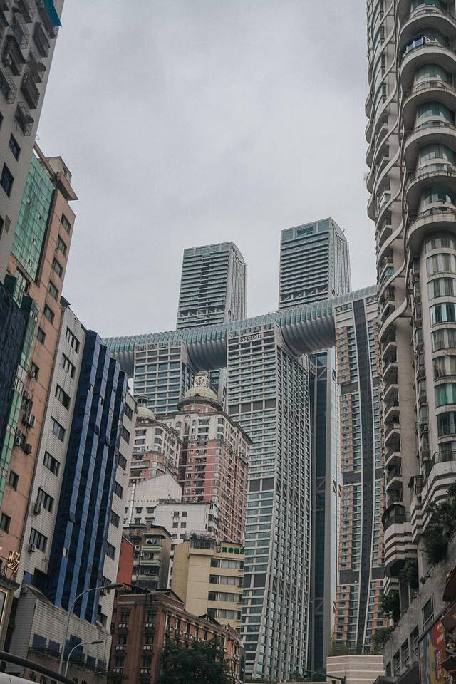 这个定位便是另一处可以直观感受到重庆魔幻的地方,直耸入云的摩天大厦和市井街头的商贩地毯,极大的反差一时让人适应不来,这是两个比邻的建筑,来福士巨大魔幻到像是末日科幻片里的邪恶组织总部一般。