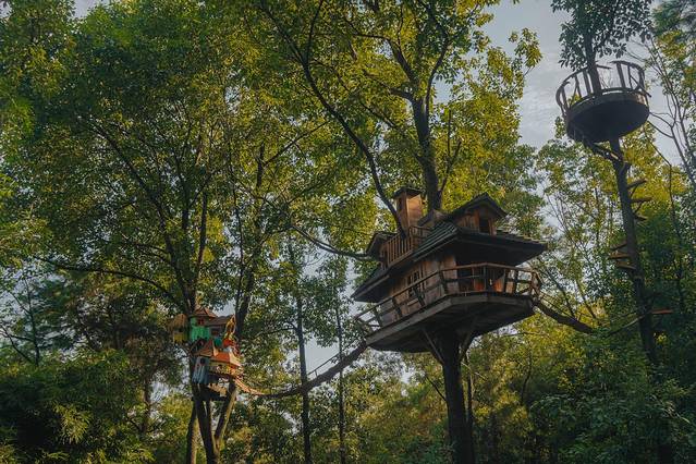 溪流旁边的树木被布置成了树屋,有小巧的门口和窗户,躲在门口旁边睁着眼睛的呆萌动物,抬头往上看,参天的大树搭建起了精致的木屋,木质小房子错落有致地分布在树枝上,通过木质楼梯连接地面,融合进这样一片小树林里,仿佛是这棵树木长出来的一间木屋。