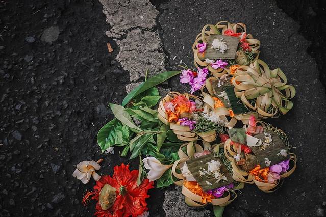 加隆安节通常持续10天之久,在这10天里,巴厘人相信他们的神回到他们身边,驻扎在整个岛屿来保佑他们。而节日的准备活动也是隆重而忙碌的,女人用未成熟的椰子编制装饰物“hanging”悬挂在车上,上图这种花篮叫做“canang”,通常还会放置米饭和鲜花,装点得像艺术品一样,男人们则用编制好的竹竿(称为“Penjors”)点缀家门口,这个是每家都要亲手做的,Penjors 越高越繁复则证明这家越富裕,人丁越旺盛。