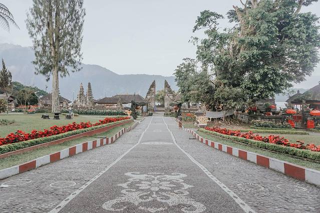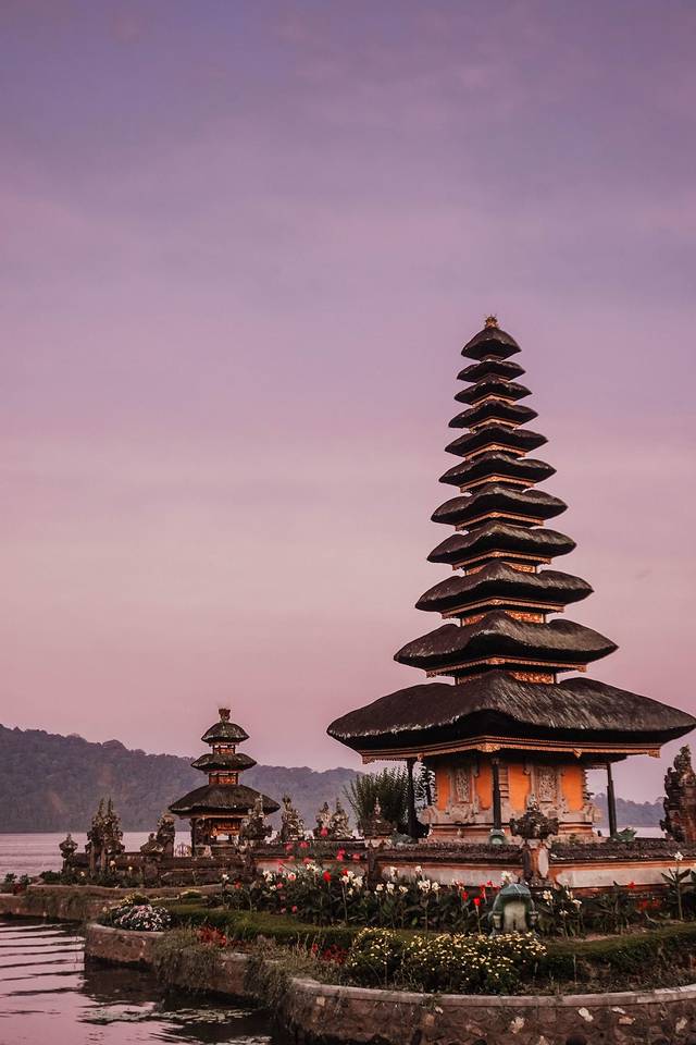这座有400年历史的寺庙建造得非常漂亮,寺庙在水光中灵动,山峦的云雾映着晚霞染出橘色、红色的霞光,据说在1926年,大部分地区被熔岩覆盖和摧毁,但重建后,这里又恢复了美丽。