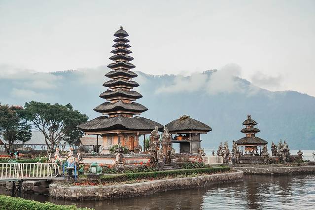 水神庙的全名为布拉坦湖的水神庙,被布拉坦湖畔环绕,层层迭迭的茅草主庙倒映在水中,用于供奉和湖泊女神戴维达努,水神庙的主庙被花园围绕,背后是经常云雾不散的山峦,这里是巴厘岛唯一建在水上的寺庙,连五万印度尼西亚盾纸币的背景图案也是用水神庙来做的。