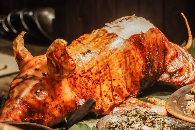 烤乳猪是巴厘岛最特色菜品之一,它是将整只乳猪用各种香料填满,再加入木薯叶和各种混合蔬菜,架在炭火上来回翻滚,烤至外焦里嫩,整只乳猪金黄油亮,香气四溢,再搭配鲜艳的特制辣椒酱,简直是视觉和味觉的双重享受。