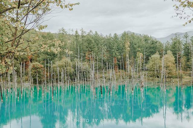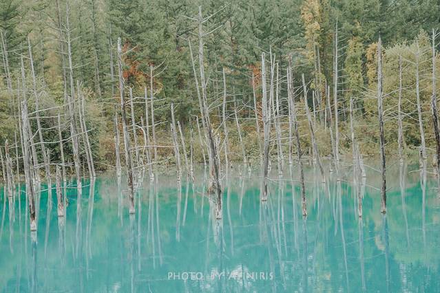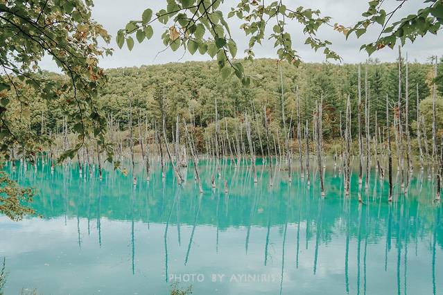 青池位于十胜山麓的白金温泉附近2.5千米处,是一处水面泛着青蓝色的池塘,池塘里立着枯死的落叶松树干。青池并非天然形成,由于北海道开发局在十胜山内沿一部分地表径流修筑了一些防止泥石流和火山熔岩的导流渠与堤坝,恰好此处的一少部分水流被堤坝人为阻隔,积水形成了一处池塘,而水中富含的氢氧化铝等白色系微粒与水对太阳光的共同作用,使得水面反射出蓝色。